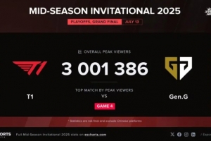 體育資訊7月13日訊 外媒Esports Charts發布T1對戰GEN第四局海外峰值已突破三百萬,不僅再次打破本屆MSI歷史,同時也是歷屆MSI海外峰值最高的一次。