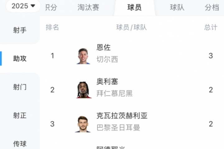 在2025世俱杯助攻榜上,切爾西中場恩佐3次助攻榮膺助攻王,奧利塞等多名球員都是2次助攻。
