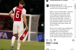 體育資訊7月15日訊 亨德森與阿賈克斯解約,據悉即將免簽加盟布倫特福德,他在社交媒體上發文,與阿賈克斯告別。