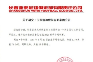 經(jīng)友好協(xié)商,長春亞泰足球俱樂部與球員胡安·卡米洛簽訂工作合同。即日起,他將代表長春亞泰隊征戰(zhàn)2025賽季中超聯(lián)賽。