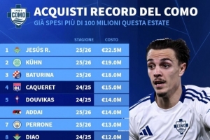 體育資訊7月18日訊 德國轉會市場盤點了科莫隊史引援排行,今年夏天已花費超過1億歐。
