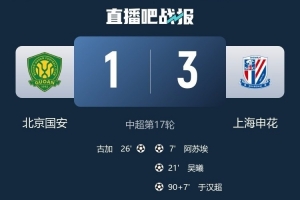 體育資訊7月19日訊 中超第17輪,北京國安1-3不敵上海申花。