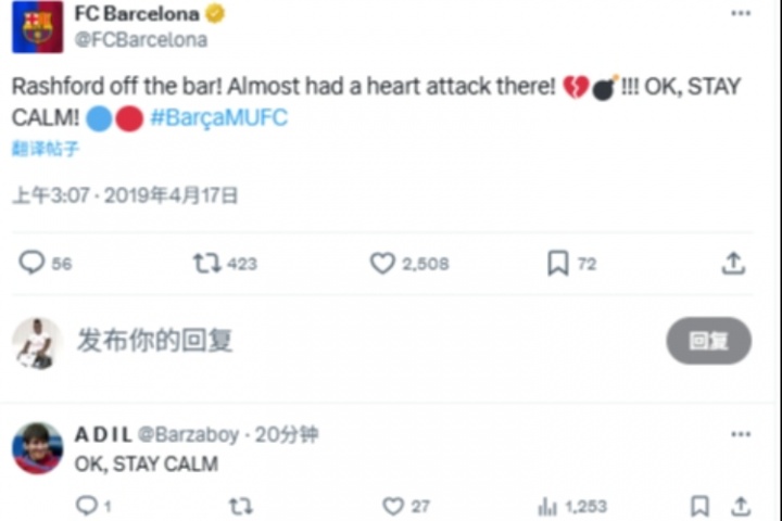 有球迷翻到19年4月17日歐冠巴薩vs曼聯時,巴薩官方推特的一條推文:“拉什福德擊中橫梁!差點心臟病發作!好吧,冷靜!”球迷今日跟上評論:“好吧,冷靜!”