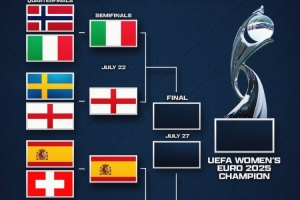 體育資訊7月20日訊 2025女足歐洲杯半決賽對陣出爐,意大利、英格蘭、西班牙和德國會師四強。
