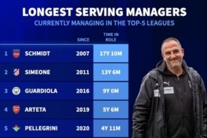 體育資訊7月21日訊 德轉(zhuǎn)統(tǒng)計(jì)了五大聯(lián)賽教練當(dāng)前執(zhí)教時(shí)間數(shù)據(jù),德甲海登海姆主帥弗蘭克-施密特帶隊(duì)超17年居首,西蒙尼、瓜迪奧拉、阿爾特塔分列二三四位。