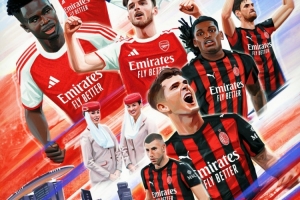 今日阿森納官方社媒發布季前賽對陣AC米蘭的海報,海報中槍手薩卡、厄德高、賴斯 VS 米蘭普利西奇、萊奧等球員。