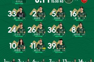 上海海港首發:1-顏駿凌、3-蔣光太、5-張琳芃、15-明天、32-李帥、6-徐新、10-馬特烏斯-維塔爾(F)、9-古斯塔沃(F)、27-馮勁、30-加布里埃爾(F)、45-萊昂納多(F)