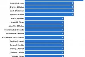 4次:阿森納&切爾西、阿森納&富勒姆、維拉&切爾西、伯恩茅斯&紐卡、伯恩茅斯&諾維奇、伯恩茅斯&南安普頓、布萊頓&伊普斯維奇、伯恩利&曼城、伯恩利&諾維奇、切爾西&水晶宮、切爾西&富勒姆、切爾西&萊斯特城、伊普斯維奇&西布朗、萊斯特城&謝菲聯、南安普頓&西漢姆