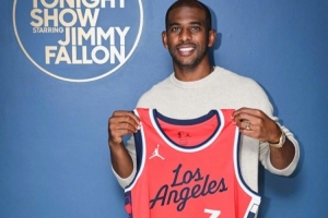 日前,保羅帶著3號快船球衣亮相《吉米今夜秀》(The Tonight Show),并與主持人一同合影。