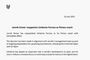 體育資訊7月23日訊 現(xiàn)男子網(wǎng)球世界第一辛納團(tuán)隊(duì)發(fā)表聲明,體能師翁貝托-費(fèi)拉拉回歸團(tuán)隊(duì),原來的體能師帕尼奇將加入魯內(nèi)團(tuán)隊(duì)。