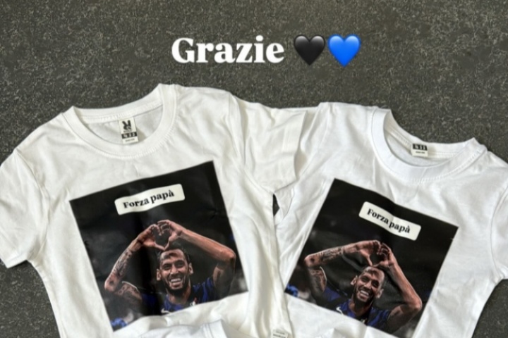 恰爾汗奧盧的第三個孩子于2023年出生,照片上的三件小碼T恤對應著恰爾汗奧盧的三個孩子,同時T恤上用意大利語寫著“爸爸加油”,配圖是恰爾汗奧盧身穿國米球衣時手比愛心。