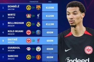 4(并列)、埃基蒂克,2025-26賽季,法蘭克福→利物浦,9500萬歐元