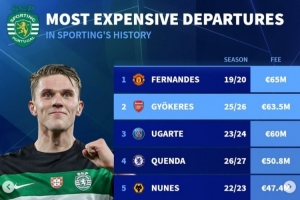 體育資訊7月27日訊 阿森納已經官宣簽下瑞典中鋒約克雷斯,《轉會市場》也統計了葡體歷史最貴賣人情況。