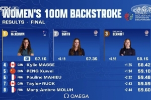 體育資訊7月29日訊 2025新加坡世界泳聯世錦賽,女子100米仰泳決賽,麥基翁57秒16打破賽會紀錄奪冠,雷根-史密斯獲得銀牌,彭旭瑋59秒10刷新PB,最終排名第五。