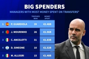 體育資訊7月30日訊 《轉會市場》統計了主教練生涯轉會費支出榜,瓜帥無懸念居首。