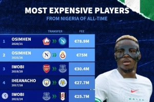 體育資訊7月31日訊 奧斯梅恩轉會加拉塔薩雷只待官宣,《轉會市場》也統計了尼日利亞球員歷史轉會費榜單,奧斯梅恩獨占前二。