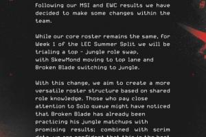 雖然核心陣容保持不變,但在LEC夏季賽第一周中我們將對(duì)打野位與上單位進(jìn)行輪換。SkewMond將出任上單位置,BrokenBlade將出任打野位置。