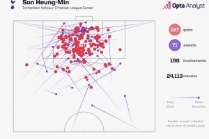 據Opta統計,2015-2016賽季孫興慜加盟熱刺以來,他在英超聯賽中參與198球,同期僅少于薩拉赫(270球)和凱恩(231球)。