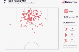 體育資訊8月2日訊 孫興慜將在今夏離開熱刺,Opta統計了他在英超的進球數據。