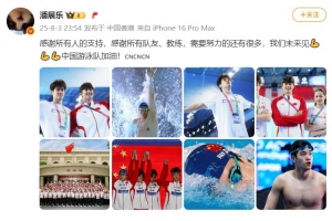 潘展樂曬出了游泳隊的合照以及多張自己的賽場圖,并配文寫道:感謝所有人的支持,感謝所有隊友、教練,需要努力的還有很多,我們未來見,中國游泳隊加油!