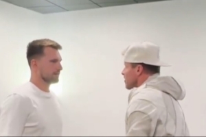 有趣的是,布萊恩-利特爾單膝跪在桌子上,與東契奇平視交流。