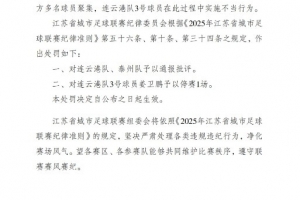 江蘇省城市足球聯賽官方表示,在連云港隊主場對陣泰州隊的比賽第67分鐘,在裁判員鳴哨停止比賽后,雙方多名球員聚集,連云港隊3號球員在此過程中實施不當行為。