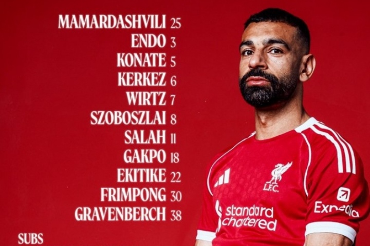 利物浦首發:25--瑪瑪達什維利、5-科納特、6--科爾克茲、30-弗林蓬、38-赫拉芬貝赫、3-遠藤航、7-維爾茨、8-索博斯洛伊、18-加克波、11-薩拉赫、22-埃基蒂克