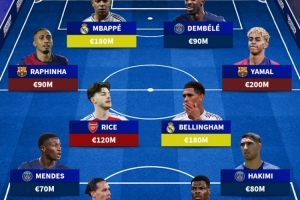 中場/邊鋒:拉菲尼亞(9000萬歐)、賴斯(1.2億歐)、貝林厄姆(1.8億歐)、亞馬爾(2億歐)