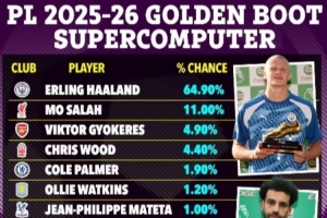 體育資訊8月8日訊 根據(jù)《太陽報》報道,超算預(yù)測新賽季英超射手榜,哈蘭德有64.9%的概率拿到金靴,薩拉赫11%第二。