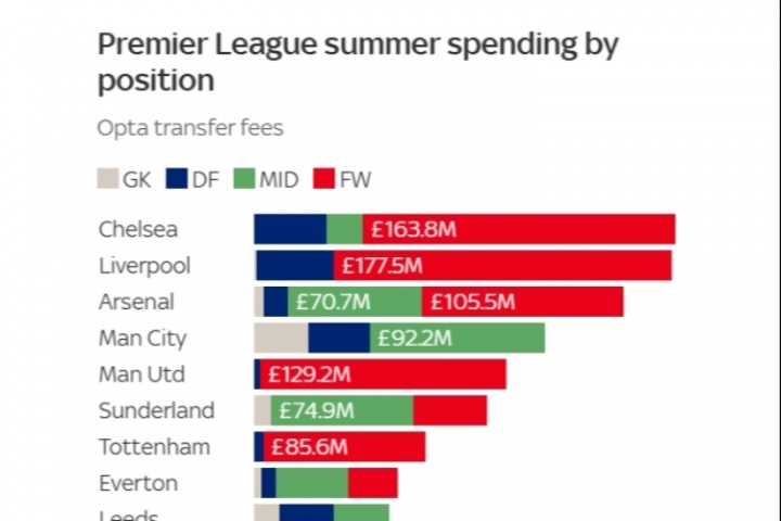 體育資訊08月08日訊 今夏英超聯賽在轉會市場上投入巨大,天空體育統計了英超各隊今夏的轉會支出,并將各隊支出按位置進行分類。