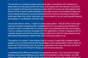 手術決定是在與醫療團隊協商后作出的,并得到俱樂部的完全認可。此舉始終以我的健康和長遠職業生涯為首要考慮,而這自然與巴薩的目標完全一致:讓我盡早以最佳狀態回歸,繼續為冠軍而戰。此外,我已公開宣布術后所需的最短恢復期,這一時間基于權威專家的評估,且始終與俱樂部保持同步。