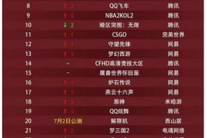 體育資訊8月9日訊?!7月網吧熱度排行榜出爐,LOL第一瓦第二 粥和CF分列三、四,,前十僅永劫無間不是騰訊游戲。