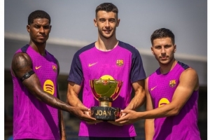 巴薩官方更新社媒動態,曬出三位新援拉什福德、霍安-加西亞、巴德吉手捧甘伯杯獎杯的合照,配文:“為主場首秀做好準備。”
