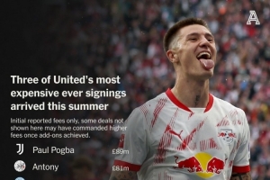 體育資訊8月9日訊 媒體TA統(tǒng)計了曼聯(lián)引援的轉(zhuǎn)會費(fèi),并列出榜單,博格巴8900萬英鎊居首,安東尼次席,前10名球員中有3人是在今夏加盟。
