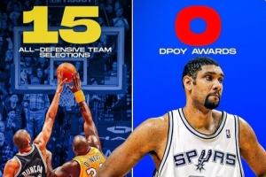 鄧肯生涯15次入選最佳防守陣容,但從未拿過年度最佳防守球員,本-華萊士拿過4次。