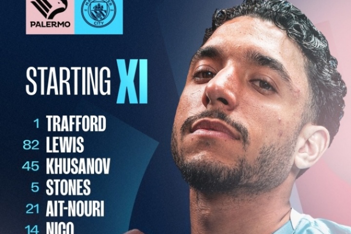 曼城首發:1-特拉福德、82-劉易斯、45-胡桑諾夫、5-斯通斯、21-努里、14-尼科-岡薩雷斯、33-奧賴利、52-鮑勃、29-謝爾基、7-馬爾穆什、9-哈蘭德