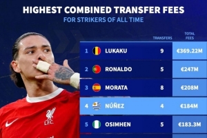 體育資訊8月11日訊 德國轉會市場統計了前鋒累計轉會費,并列出榜單,盧卡庫3.6922億歐居首,C羅、莫拉塔、努涅斯排名前四。