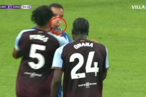 奧納納當(dāng)時(shí)突然捂住自己的臉,轉(zhuǎn)身看向本場(chǎng)比賽的法國(guó)裁判米洛特。隨后明斯上前抓住格林伍德球衣,格林伍德球衣在沖突中被扯爛。