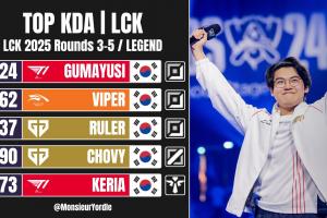 體育資訊8月11日訊 今日韓媒放出LCK 2025 Rounds 3-5 傳奇組的選手KDA排行榜,Guma第三賽段KDA8.24位列LCK第一,Viper、Ruler分居二三。