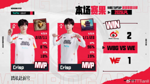 體育資訊8月12日訊?2025LPL第三賽段常規賽組內賽,WBG 2-1 WE,WBG輔助Crisp斬獲兩局MVP。