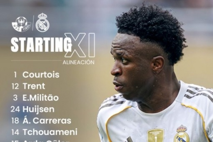 皇馬首發:1-庫爾圖瓦、12-阿諾德、3-米利唐、24-懷森、18-A費、14-瓊阿梅尼、15-居勒爾、19-塞巴略斯、21-迪亞斯、10-姆巴佩、7-維尼修斯