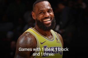 NBA歷史上僅有三位球員至少有350場常規賽單場砍下至少1蓋帽+1搶斷+1三分,他們分別是:詹姆斯(464)、杜蘭特(397)和哈登(361)。