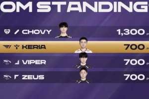 目前Keria以700點POM點數和Viper、Zeus并列排在第二,僅次于Chovy的1300點。