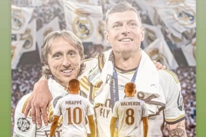 在社交媒體上,克羅斯曬出了自己和莫德里奇、姆巴佩和巴爾韋德的特效合成圖,并寫道:夢想和榮耀,歡迎和告別!