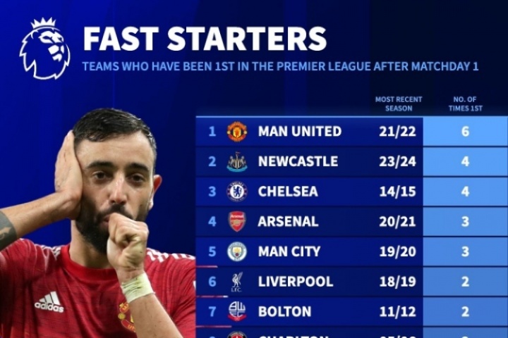 體育資訊08月15日訊 新賽季英超開賽在即,德轉列出了哪些球隊在英超第一輪后占據榜首的次數最多,曼聯以6次排名第一。