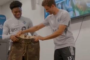 體育資訊8月16日訊 溫哥華白浪曬出視頻,穆勒給為自己讓出號碼的隊友普里索送了巴伐利亞傳統服飾。