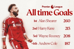 利物浦官方社媒曬出英超歷史射手榜,此役過后薩拉赫的英超進球數達到187個,追平安迪-科爾并列第四。