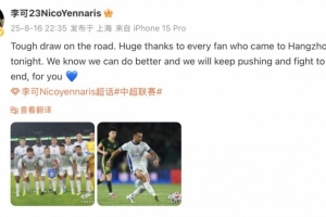 客場戰平,結果艱難。衷心感謝今晚來到杭州的每一位球迷。我們知道我們可以做得更好,我們將繼續拼搏,為你們戰斗到最后一刻。