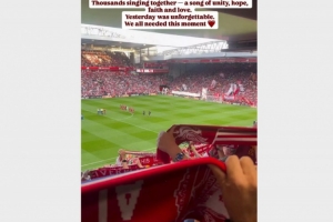 在她的帖子中,娜塔莉亞寫道:“YNWA(你永遠不會獨行)是特別的。永遠如此。這是一句宣言。成千上萬的人一起唱這首歌,一首關于團結、希望、信念和愛的歌。昨天是難忘的一天,我們都需要這一刻。”