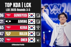 體育資訊8月18日訊 外媒Monsieur Yordle發布截至目前2025 LCK第3-5輪中KDA,分均補刀,分均輸出三項數據排名: